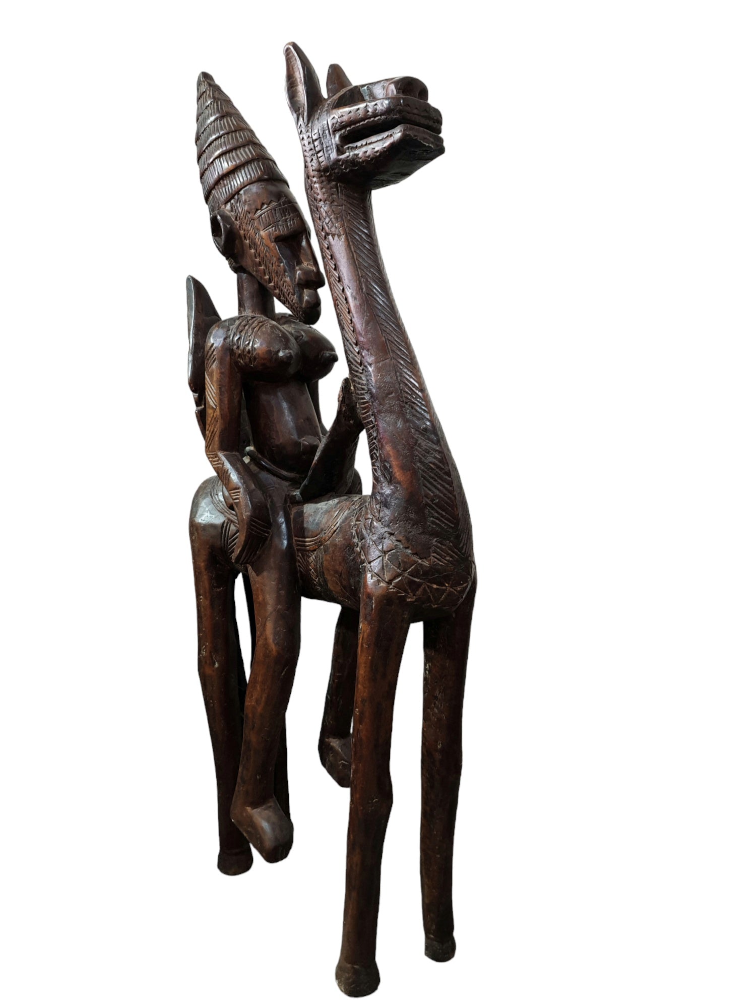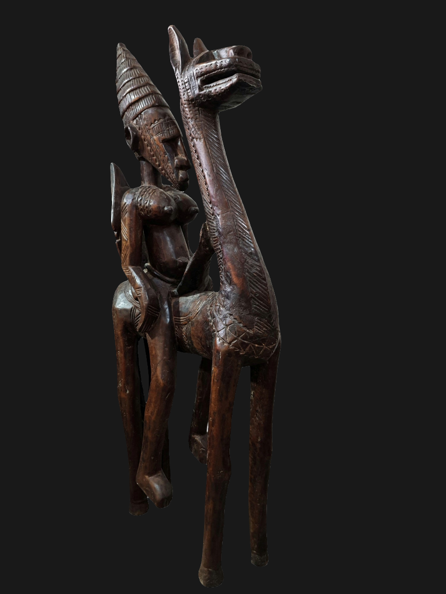 La statue est sculptée dans un bois foncé, probablement du bois de teck ou un autre bois dur couramment utilisé dans les sculptures africaines. La patine naturelle suggère une certaine ancienneté et une utilisation rituelle. LLe cavalier est assis en position droite et fier sur son cheval. Il porte un grand chapeau ou un casque qui souligne son statut élevé. Le cheval est représenté avec des jambes longues et fines, et une tête élancée, les motifs gravés sur le corps du cheval ajoutent une dimension décorative et symbolique.